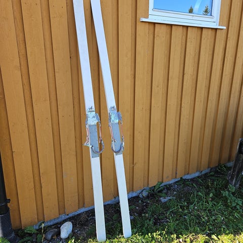 Hvite ski, forsvarets fjellski, "Nato planker" med metallbindinger og skistaver. Skiene har stålkant og ståltupp og er lite brukt.
