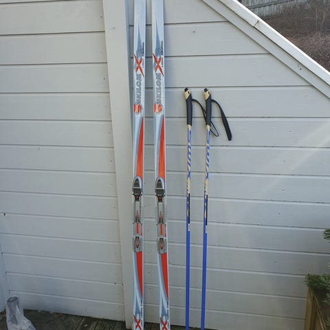 Ski med bindinger og skistaver.
