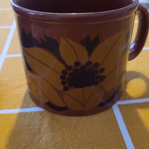 Koselig solid krus fra 70- tallet selges. Fint motiv av harar og blomster. 8 cm i diameter, høyde 10 cm.