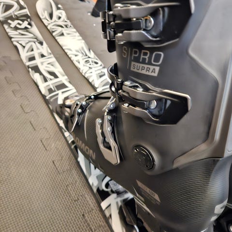 Salomon QST Pro alpinstøvler i blå og svart. Størrelse 26, som tilsvarer 41 1/3. Støvlene har fire spenner og powerstrap øverst for god tilpasning rundt leggen. Gåfunksjon på baksiden gjør dem egnet både til kjøring i bakke og til toppturbruk med kompatible bindinger. Yttersålen har gummipartier for bedre feste ved gange på hardt underlag. Innerstøvlene er polstret for komfort og støtte. Feste til nederste spenne er knekt. Jeg har vært i kontakt med Salomon og de er vanskelig å oppdrive reservedel. Det er mulig å kjøre støvlene uten denne spennen. Man har fortsatt god støtte rundt ankel og legg.
