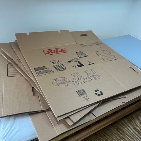 7 Store Jula esker og 1 Biltema medium flytteeske i papp. Eskene har bærehåndtak på sidene for enklere håndtering. Egnet til pakking og lagring av ulike husholdningsartikler som bøker, kjøkkenutstyr, klær og mindre gjenstander ved flytting eller oppbevaring.