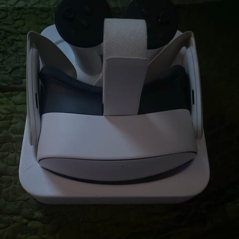 Meta Quest VR-headset i hvit farge med justerbar hodestropp og polstret ansiktspute.