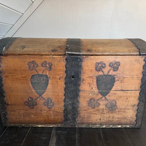 Ukjent merke trekiste med buet lokk og metallbeslag