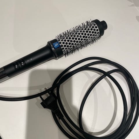 Elektrisk varmebørste med rund børste og perforert metallkropp for jevn varmefordeling. Utstyrt med ledning med støpsel til vanlig stikkontakt. Egnet til forming, volum og lett bølger i håret. Leveres med bruksanvisning som viser ulike børstehoder og bruksmuligheter.