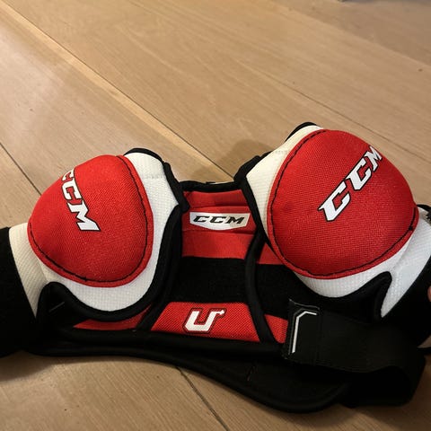 CCM Fit07 skulderbeskyttelse for ishockey. Modellen har polstrede skuldre, bryst- og ryggplater for støtdemping og beskyttelse under spill. Flerfarget design i rød, hvit og svart med justerbare stropper for tilpasning rundt overkroppen. Egnet som overkroppsbeskyttelse ved ishockeytrening og kamp.