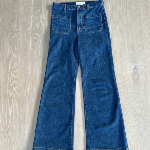 Pent brukt uten flekker , hull . Vet ikke hva modellen på jeansen heter . Str 29 . Jeg er 177 høy og til meg er den ca 1 cm fra bakken . Kjøpt på Bolina sommer 25 for ca 3300,-. Bootcut og sitter etter i lårene .