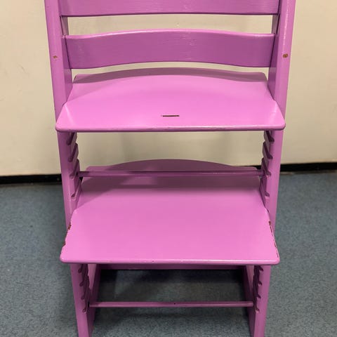 Stolen er malt. Enkelte flekker (se bilde). Enkelt å overmale. Datteren min har klistret tre hjerter på den som enkelt kan tas bort.