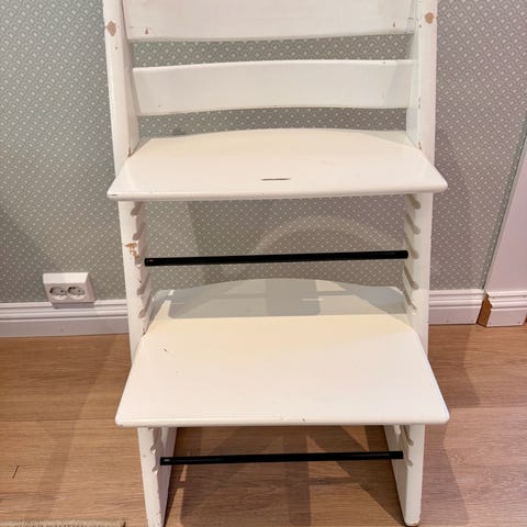 Stokke Tripp Trapp høy barnestol i grå farge. Klassisk trappeformet stol i tre med justerbar sitteplate og fotbrett som kan flyttes i høyden etter behov. Stolen er beregnet for barn og kan tilpasses barnets vekst ved å endre posisjonen på sete og fotbrett. Egner seg til bruk ved spisebord eller andre bordhøyder der barnet trenger en stabil og regulerbar sitteplass.