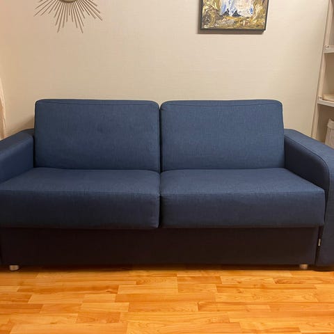Sofaen gjøres enkelt om til en romslig seng, og stua om til soverom. Oppbevaringen under setet er lett å komme til og har plass til overmadrass, sengetøy og puter.