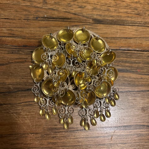 Søljen er rund med tradisjonelt filigransmønster og hengende løv Baksiden har nål og feste for bruk på bunad eller andre plagg.