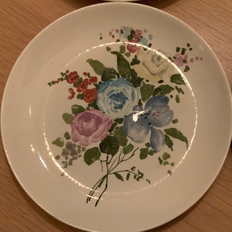 4 tallerkener og to fat fra Egersund Fayance selges samlet til høyeste bud.