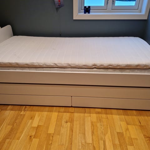 IKEA dagseng med skuffer i hvit utførelse. Sengen har flere romslige skuffer under liggeflaten som gir god oppbevaringsplass til for eksempel sengetøy, klær eller leker. Passer som enkeltseng på soverom, barnerom eller gjesterom sengen er lite brukt og madrass er 1 år gammel fra Møbelringen.