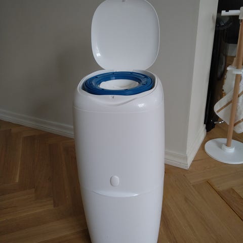 Angelcare bleiebøtte i hvit farge. Bleiebøtten er utviklet for luktreduserende oppbevaring av brukte bleier ved hjelp av et luktsperresystem (Odour Seal). Den har lokk på toppen og åpning med knapp på forsiden for enkel bruk. Passer til bruk på stelleplassen hjemme eller i barnerommet for hygienisk håndtering av bleier.