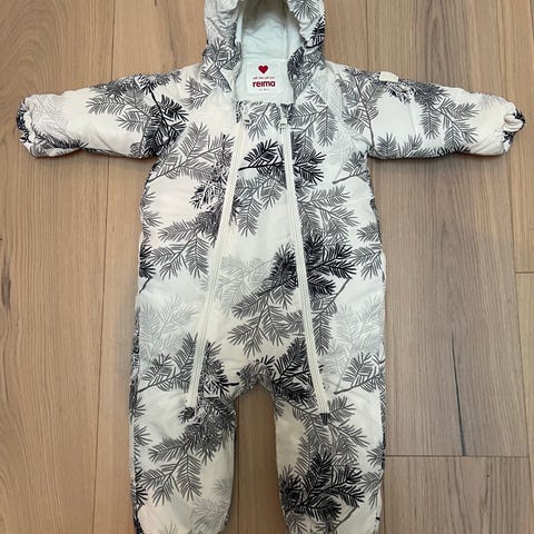 Pent brukt vinterdress i str 68. Syns den var litt stor i størrelsen. Lite slitasje siden barna ikke kunne bevege seg så mye i den. Liten rød flekk som ikke gikk bort i vask. Praktisk med glidelås ved beina også.