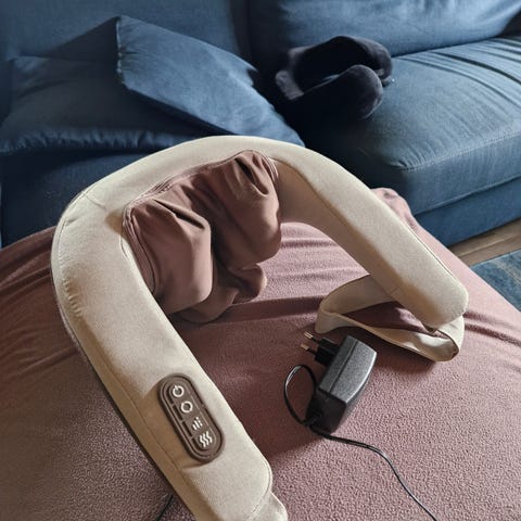 Beurer Wellbeing 4D nakkemassasjer. Elektrisk massasjeapparat for nakke og skuldre med 4D-massasjehoder. Utformet som en krage som legges rundt nakken, med betjeningsknapper på siden. Egnet til bruk hjemme for punktvis massasje av nakke- og skulderområde.