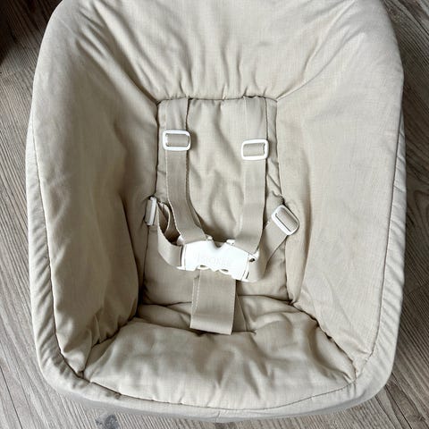 🧡Stokke Tripp Trapp barnestol i tre med naturfarget finish. Designet gjør at barnet kan sitte ved bordet i en ergonomisk sittestilling. Stolen har normalt bruksmerker ettersom den er fra 2007, passer med baby sett i plast og trebøyle. Det følger også med pute sett, har en liten hull på siden se bilder som kan sikkert fikses og mangler et borrelås på en side se bilder. Stolen må hentes, sender ikke.