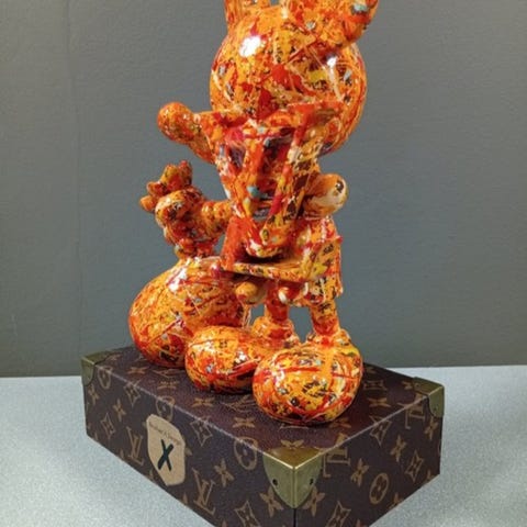 Selger et moderne street art-kunstverk av Mickey Mouse plassert i et tannlegekontor, iført Louis Vuitton-inspirerte klær. Motivet kombinerer humor, popkultur og luksusreferanser i et kontrastfylt og samtidsrettet uttrykk.