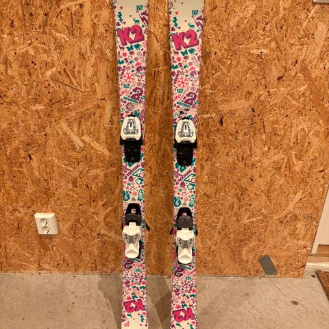 K2 alpinski med bindinger. Skiene har flerfarget overside med markering for midtsåle og boreanbefaling (3,6 mm x 7,5 mm bor). Undersiden er lys med mørke K2-logoer og grafiske symboler. Skiene leveres med monterte bindinger i kontrastfarger. Egner seg til alpint bruk i preparerte løyper og variert terreng.