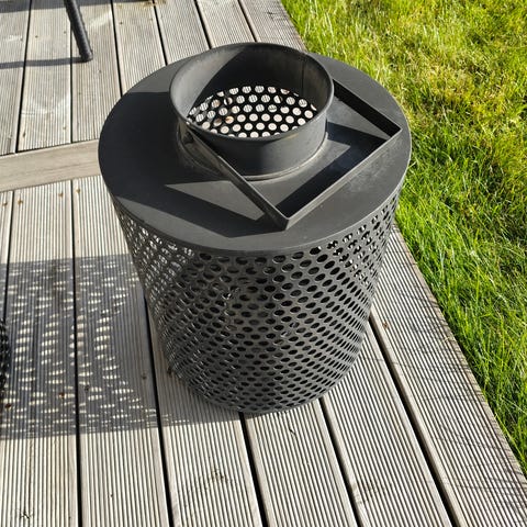 Alle deler er i SS304 stål og kommer med bunnring for å heve båltønnen fra underlaget.