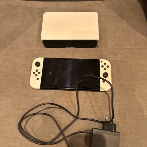Nintendo Switch OLED spillkonsoll. Konsollen har hvite Joy-Con-kontrollere og medfølgende dokk. Er også med en ekstra kontroller, Joy-Con-holder, håndreim til Joy- con (x1),strømadapter og et Nintendo Switch-spill (Lego The Incredibles) . Konsollen kan brukes både håndholdt og tilkoblet TV via dokken.