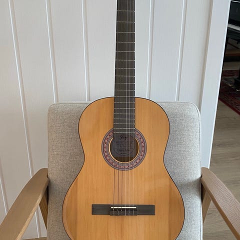 Alfwood AC 2N akustisk gitar i naturfarge. Klassisk nylonstrengsgitar med lys topp og mørk bakside og hals. Modellen har tradisjonell rosett rundt lydhullet og åpen hodestokk med mekaniske stemmeskruer. Passer til akustisk spilling, øving og generell bruk for gitarister som ønsker en klassisk nylonstrengsgitar.