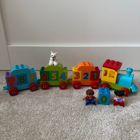 LEGO DUPLO togtog med tallklosser i ulike farger. Toget består av lokomotiv og vogner med store, fargerike klosser merket med tall fra 1 til 9. det mangler tall 8, det er 0 istedenfor.