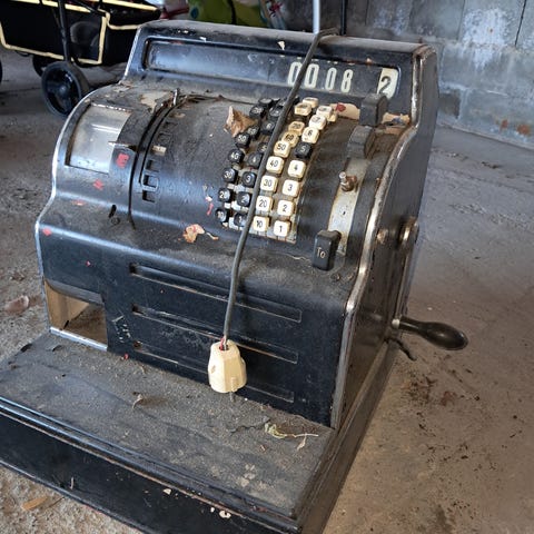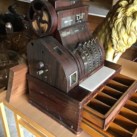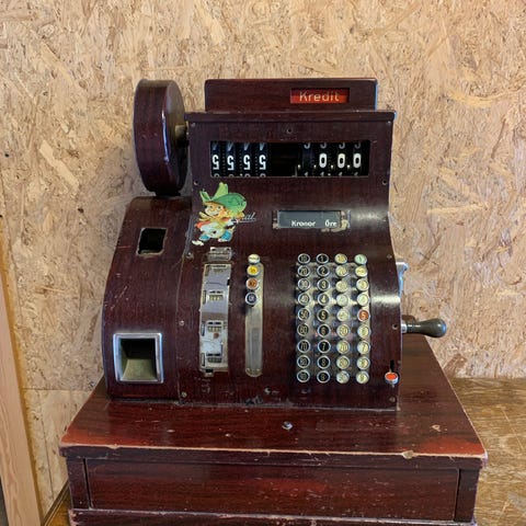 National mekanisk kasseapparat i metall med dekorert overflate og flere tast-/spakrekker for registrering av beløp. Apparatet har teller for kroner og øre øverst, samt sveiv/håndtak på siden for betjening. Klassisk, tung konstruksjon som egner seg som samlerobjekt, utstillingsgjenstand eller dekor i butikk, kafé eller hjemmeinteriør. Alders- og funksjonsstatus bør kontrolleres nærmere av kjøper ved behov.