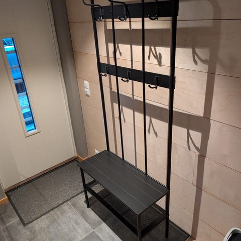 Roterbar med stort speil, hyller og knagger.