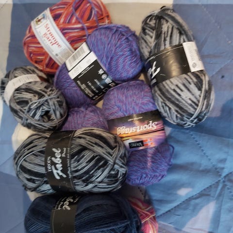 Div bunter med garn i ulike farger og typer, mesteparten i hele bunter pluss litt løst, ca 600 gram totalt. Kan sendes med PostNord for kr 69