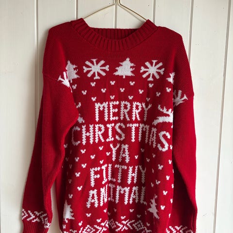 Silly Santa kjole for dame i størrelse 3XL. Kjolen er rød med hvitt mønster, blant annet reinsdyr, trær, hjerter og snøkrystaller. Rund hals og lange ermer. Materiale i akryl. Passer som sesonggenser eller hverdagsplagg på kalde dager.