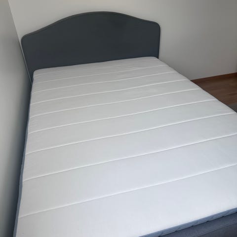 IKEA seng med madrass og overmadrass i hvit farge. Sengen har rette, enkle linjer og står på runde metallben. Overmadrassen ligger oppå hovedmadrassen og har strukturert trekk med håndtak i sidene for enklere håndtering. Passer som vanlig sengeløsning i soverom eller gjesterom. Størrelse er ikke oppgitt og bør kontrolleres ved henting.