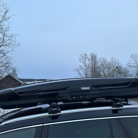 Skiguard 860 takboks i Navarrablå farge. Montert på Thule WingBar edge (passer på E-tron). Egnet for ekstra bagasje, ski og annet utstyr på taket av bilen. Aerodynamisk form gir lav profil på biltaket.