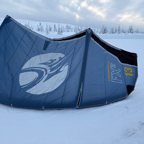 Kiten er lite brukt, har aldri vært reparert, og fremstår som ny. Bag og bar følger med.