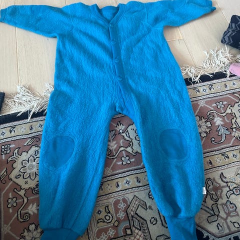 Joha ulldress til barn i størrelse 92 (ca. 86/92). Dressen er i blå merinoull med mønster og har lange ermer og ben. Plagget er unisex og egner seg som varmende lag til hverdagsbruk eller under yttertøy. Materiale: 100 % merinoull.