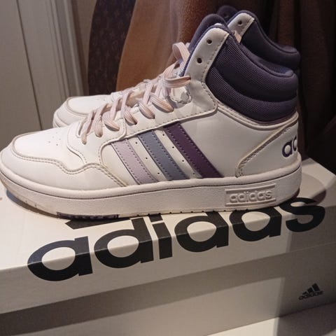 Adidas sneakers joggesko i størrelse 37. Modellen er en høy variant med snøring og polstret ankelparti. Skoene er hovedsakelig hvite med lilla detaljer og de karakteristiske Adidas-stripene på siden. Overdelen er i syntetisk materiale med perforeringer i tåpartiet for ventilasjon. Yttersålen er i gummi for godt grep. Passer til hverdagsbruk og fritidsaktiviteter.