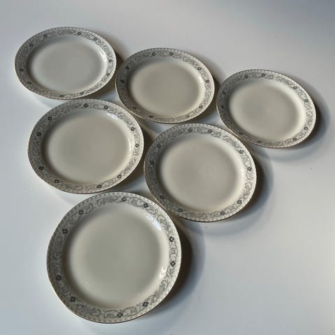 Selger 14 stk. asjetter fra Rosenthal, modell Sanssouci i hvit modell med gullkant. Sanssouci-serien ble opprinnelig designet i 1745, da Fredrik den store fikk sitt vakre rokokkoslott Sanssouci bygget i Potsdam. Fredrik ønsket et eget servise for slottet og den vakre opphøyde dekoren på serviset matcher stukkaturen i taket. Designet har et sofistikert og elegant utrykk og produseres likt i dag som da det først ble laget. Asjettene er 17,5 cm i diameter. Perfekt stand. Fremstår ubrukt. Nypris er ca. 300 kr per stk. Selges for 150 kr per stk. eller 1500 kr samlet. Kan hentes (Grünerløkka eller Sentrum) eller sendes.