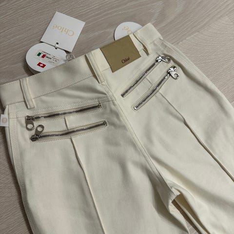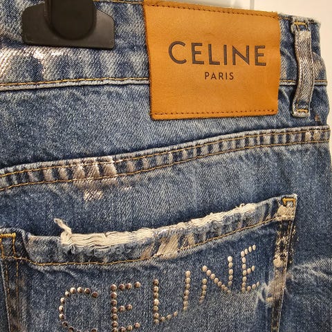 Celine jeans for dame i blå denim. Materialet er 100 % bomull. Klassisk femlommers jeans med glidelås/gylf og beltehemper. Jeansene har blå vask med lett slitte detaljer og dekorativ lenkedetalj i metall foran i livet.
