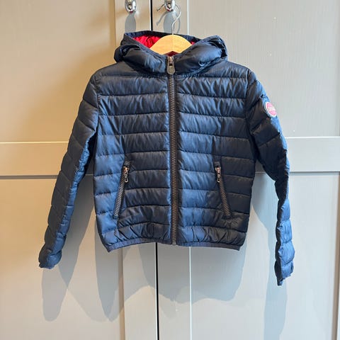 Save The Duck jakke for barn i størrelse 104. Jakken er i blå nylon og har lett vattert, quiltet design. Modellen har hette og glidelås i front. Unisex-passform som passer både gutter og jenter. Egnet som ytterjakke i overgangssesonger eller milde vinterdager. Basert på bildene har jakken noen synlige merker/slitasje på ermene.