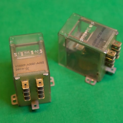 Fire industrirelèer Releco med sokkel for DIN-skinne til salgs. 150 kroner pr. stk.