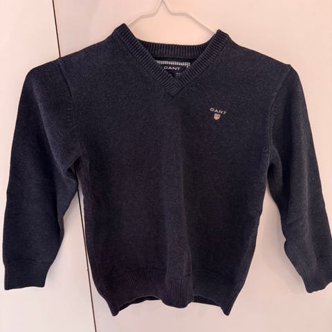 GANT genser i ull for gutt i størrelse 128. Genseren er blå og har V-hals. Materialet er 100 % ull, som gir et mykt og varmt plagg. Passer til hverdag og pent.