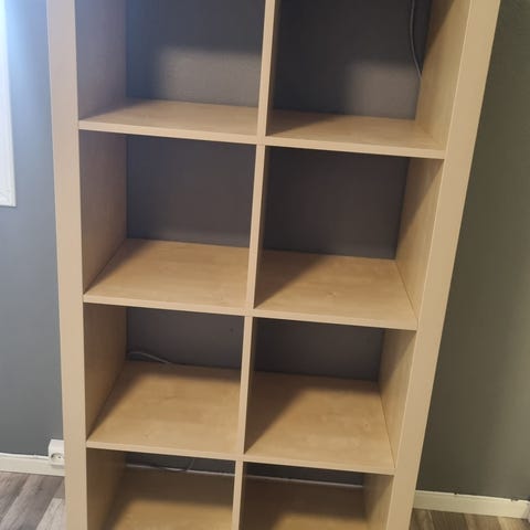 Fin hylle til bøker eller andre småting. Kan også settes på høykant. Ukjent hvilket merke det er, men hyllene har samme størrelse som KALLAX-hyllene fra IKEA, og vil nok være kompatibel med alle innsatser fra det systemet.