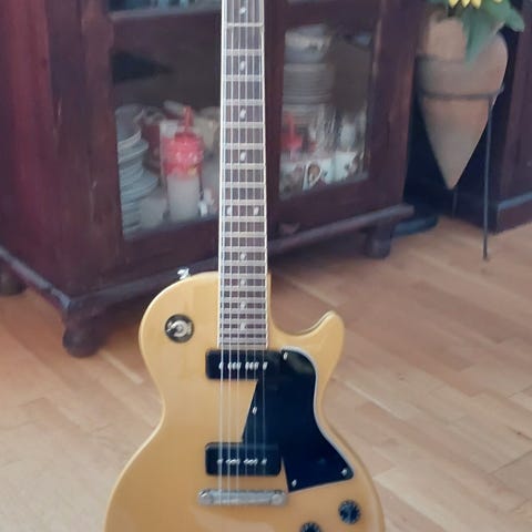 Kraftig modifisert Epiphone Spesial 2 Kustom Les Paul. Det er i utgangspunktet en Epiphone Spesial 2 fra 2011-12. Har montert pickguard fra en Gibson melody maker og Epiphone Probuckers og en Bigsby lignende tremolo med roller bridge og Grover tunere. Headstock'en er bygget om til Gibson type 'open book' og gitaren er nylakkert. Så dette er en 'one of' som ser kul ut og låter bra. Har ikke kasse, så må hentes på Vinterbro.
