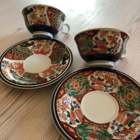 To stk håndmalte skåler i porselen i kinesisk/japansk stil og en med lilla blomstermønster og gullkant. Diameter på de to første skålene er ca 14,5 cm, den siste ca 11,5.
