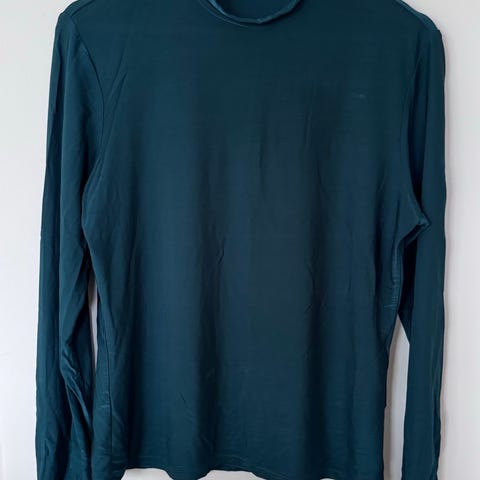 Selger en stilren og tidløs genser i en vakker støvet grønn (salviegrønn) nyanse. Modellen har høy hals og lange ermer med smal mansjett, som gir et rent og sofistikert uttrykk.
