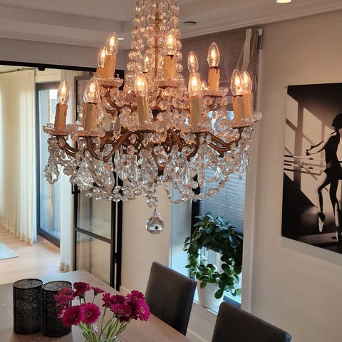 Lysekronen fremstår som pent brukt. Prismene er transparente/klare og glitrer vakkert når lyset treffer dem. Lampen kan også dimmes for alt fra stemningslys til godt arbeidslys (forutsetter dimbare pærer og kompatibel dimmer).