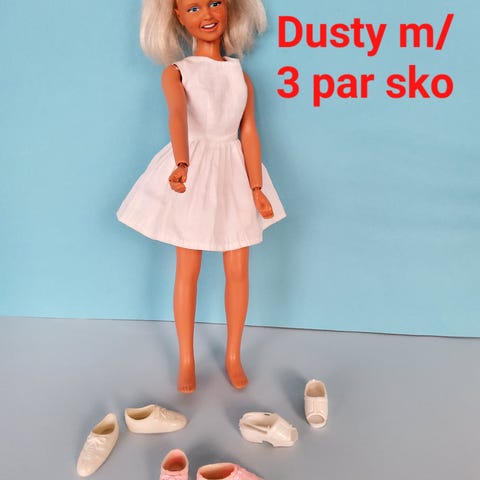NB! Dukken er litt kalvbent og mangler tre hårfester (se bilde). Sko og topp er ikke originale, men resten er originalt til dukken 🙂🩵