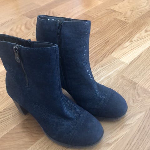 Ubetydelig brukt, fremstår nye. Sorte ankelboots fra Tamaris. Skinnimitasjon (semsket) Helhøyde 5 cm. Antiskli. Oppleves mer som str 41.