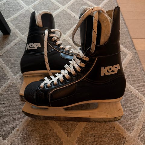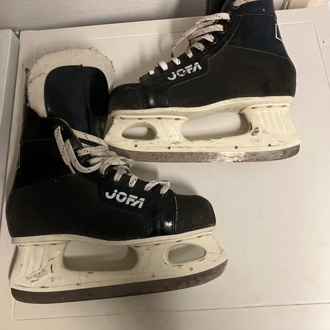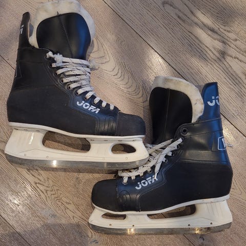 Jofa 150 ishockeyskøyter i størrelse 43. Klassiske svarte hockeyskøyter med hvite lisser og hvit skøytestålholder. Egnet til ishockey og generell bruk på isbane. Overdel i syntetisk materiale med ankelstøtte og snøring foran for justering av passform. Skøytene har stålklinge tilpasset ishockeybruk.