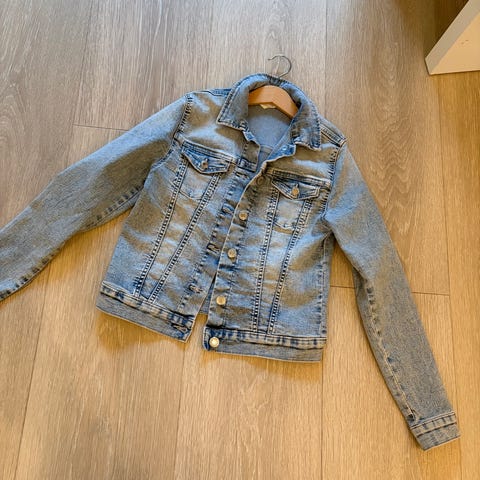 Kul dongerijakke til jente fra H&M i lysblå dongeri farge. Str. 152/14 år, men er litt stor i str så passer bedre 158-164. tilsvarer XS’ i damestr.