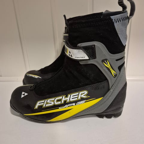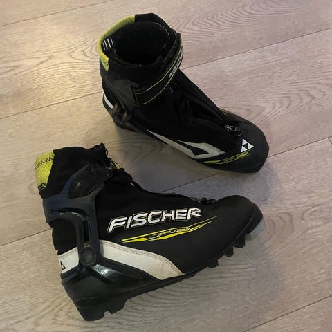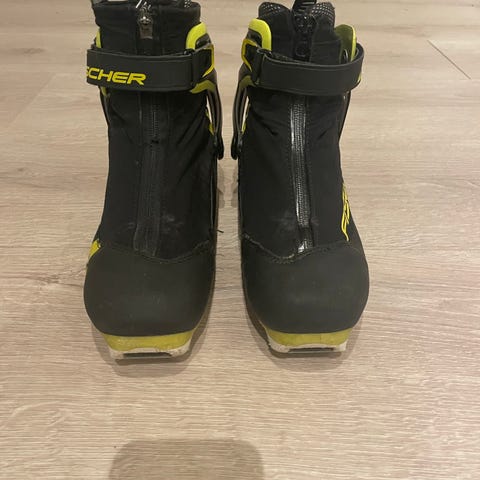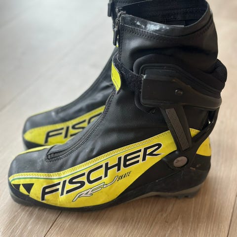 Fischer RC5 Skate skistøvler i str. 39. Modellen er beregnet for skøyting og har høy ankelstøtte med justerbar stropp og spenne for bedre stabilitet. Overdelen er i hovedsak svart med grå og gule detaljer. Støvlene har glidelås og beskyttende overtrekk foran for å skjerme mot snø og fukt.